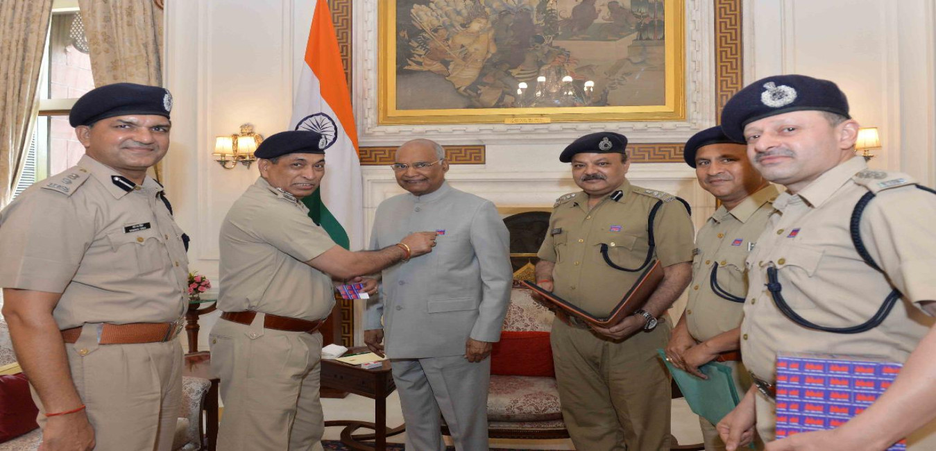 Shri Vipin Kental along with a delegation from Delhi Fire Service meeting with the President of India, Shri Ram Nath Kovind, at Rashtrapati Bhavan on April 15, 2019.