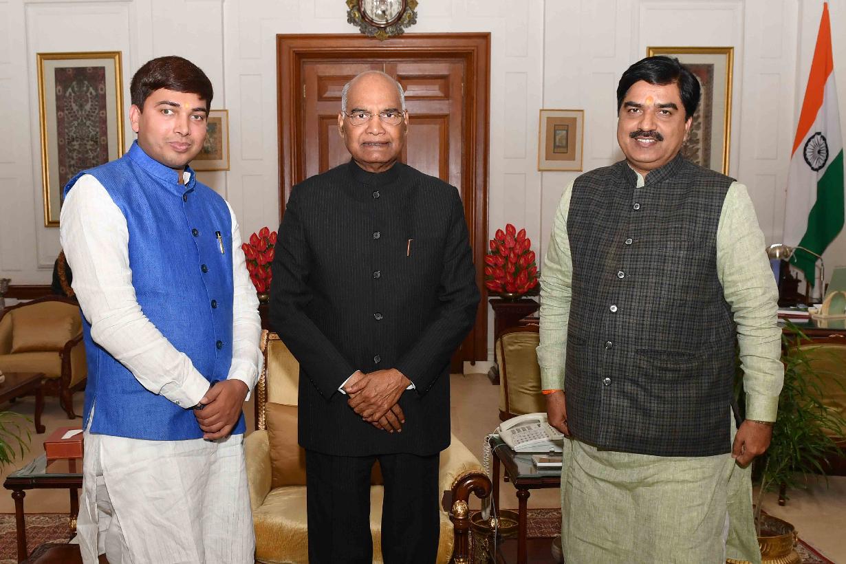 Shri Ashok Choudhary MLC along with his daughter Ms. Shambhavi Choudhary and Shri Rohtas Jhangu, Leader, JDU meeting with President of India, Shri Ram Nath Kovind, at Rashtrapati Bhavan on February 02, 2019.