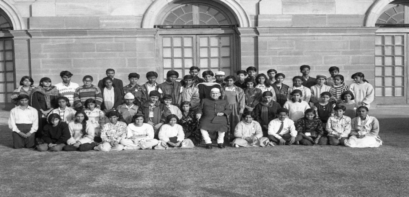 The President of India, Dr. Shankar Dayal Sharma meeting with students attending the 24th National Integration Camp being organised by the Nehru Bal Sangh at Rashtrapati Bhavan in New Delhi on November 28, 1995.