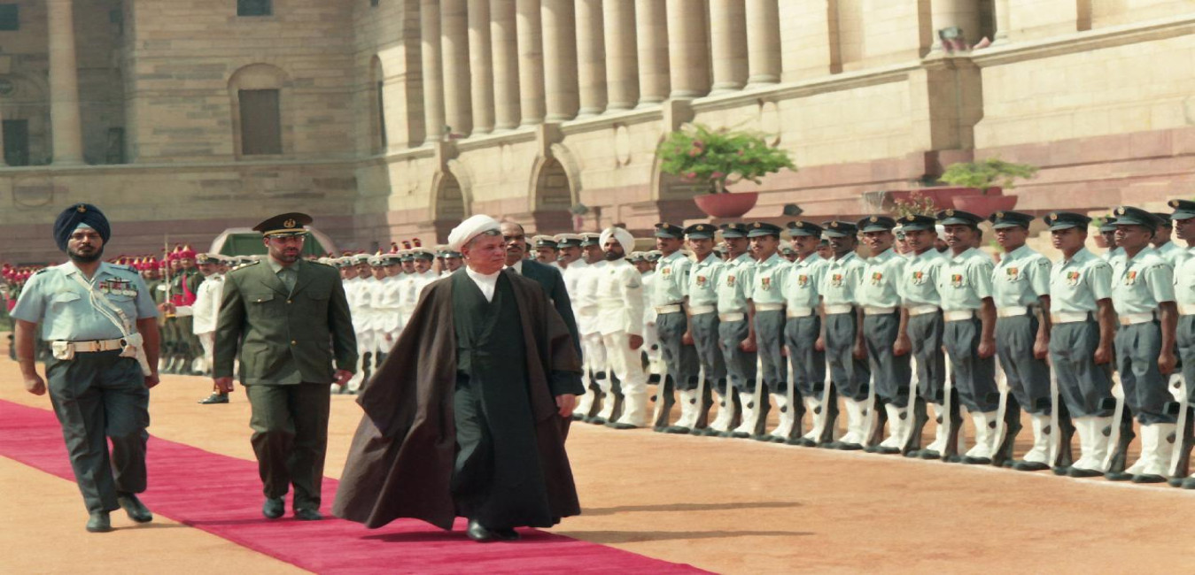 The President of India, Dr. Shankar Dayal Sharma receiving the President of Islamic Republic of Iran, H.E. Mr. Akbar Hashemi Rafsanjani at the Ceremonial Reception, at Rashtrapati Bhavan in New Delhi on April 17, 1995.