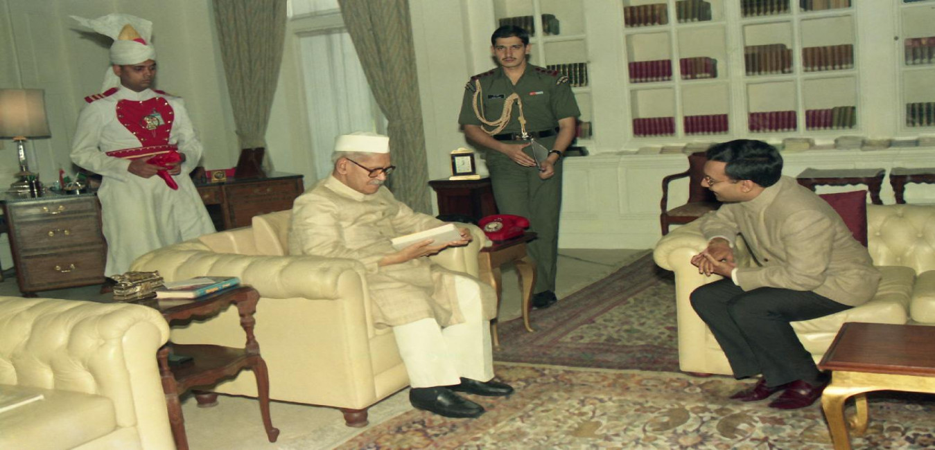 The President of India, Dr. Shankar Dayal Sharma meeting with Mr. Gautam S. Kaji, Managing Director of the World Bank at Rashtrapati Bhavan in New Delhi on April 13, 1995.