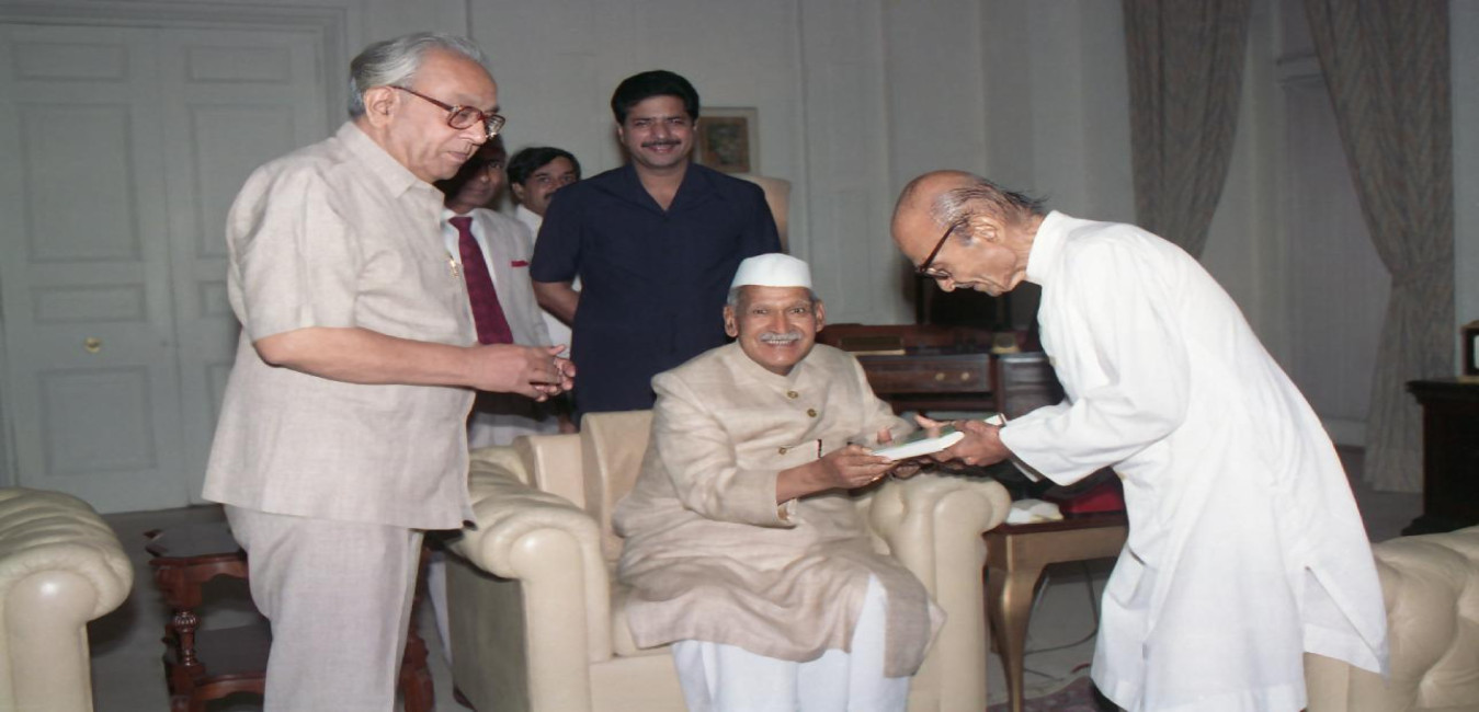 The President of India, Dr. Shankar Dayal Sharma receiving a copy of the book from Shri Raju at Rashtrapati Bhavan in New Delhi on September 22, 1994.