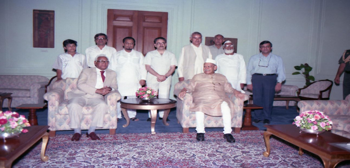 The President of India, Dr. Shankar Dayal Sharma meeting with Shri Somnath Chatterjee with others MPs from Left Parties and Janata Dal at Rashtrapati Bhavan in New Delhi on May 13, 1994.