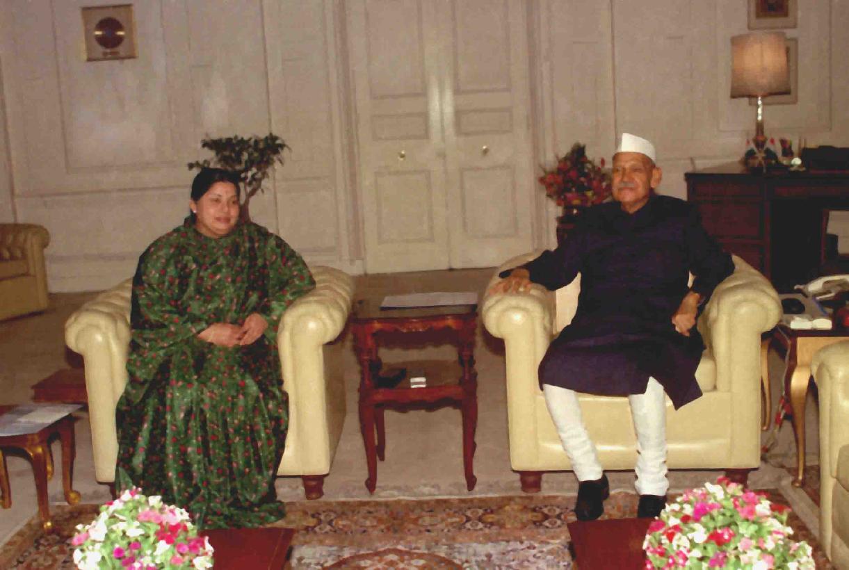 The President of India, Dr. Shankar Dayal Sharma meeting with Ms. Jayalalitha, Chief Minister of Tamil Nadu at Rashtrapati Bhavan in New Delhi on January 15, 1994.