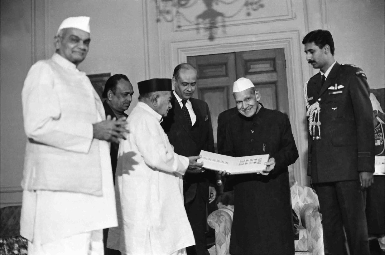 The President of India, Dr. Shankar Dayal Sharma receiving "Mercy Stamp" from Lt-Gen A.K. Chatterjee, Chairman, Animal Welfare Board with others at Rashtrapati Bhavan in New Delhi on January 14, 1994.