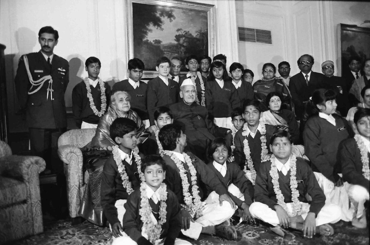 The President of India, Dr. Shankar Dayal Sharma meeting with National Awardee Children of the Indian Council for Child Welfare at Rashtrapati Bhavan in New Delhi on January 19, 1994.
