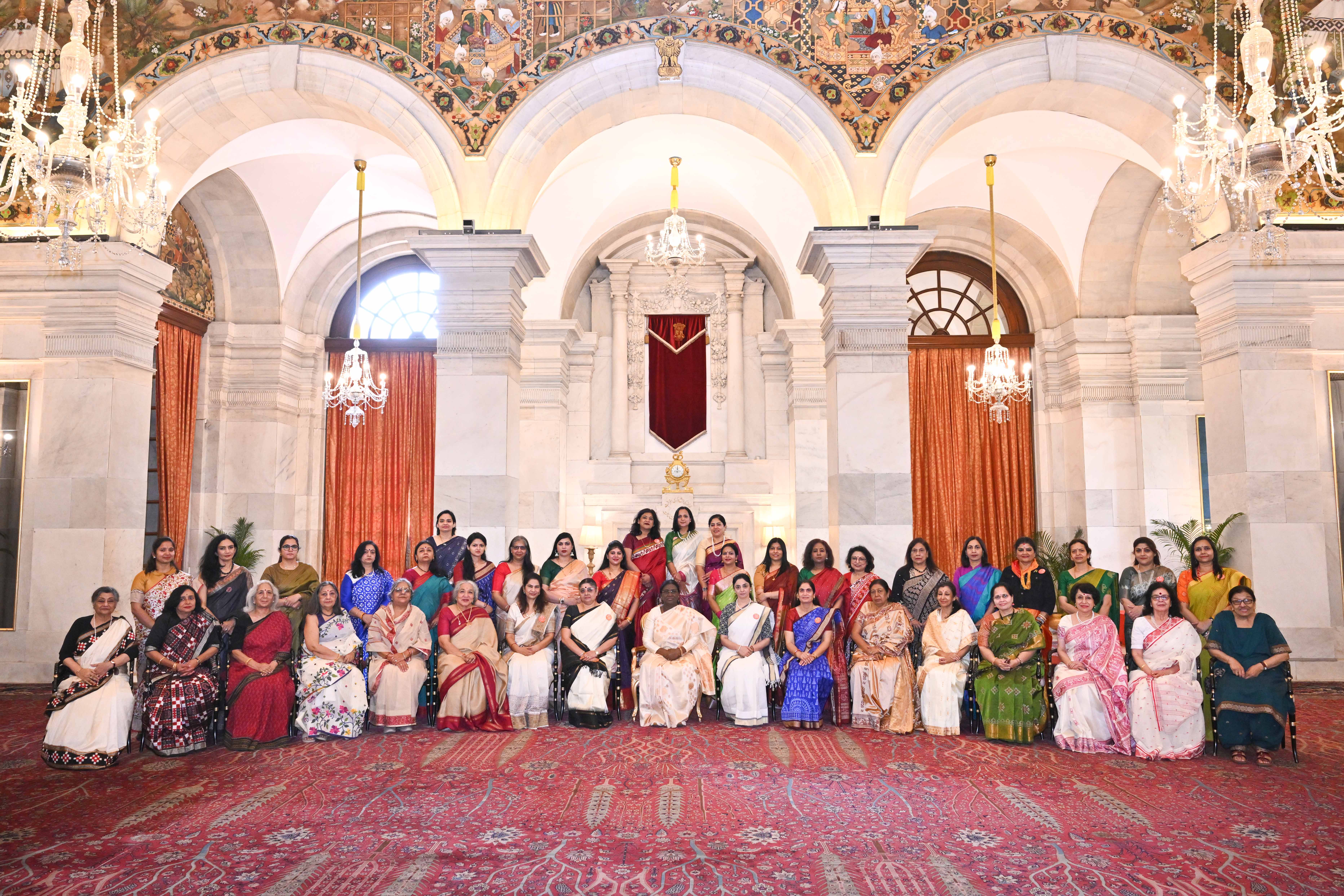 The President of India, Smt Droupadi Murmu met and interacted a group photograph with Shri Poonam Sharma, National President, FICCI FLO along with 36 other members at Rashtrapati Bhavan on March 25, 2026.
