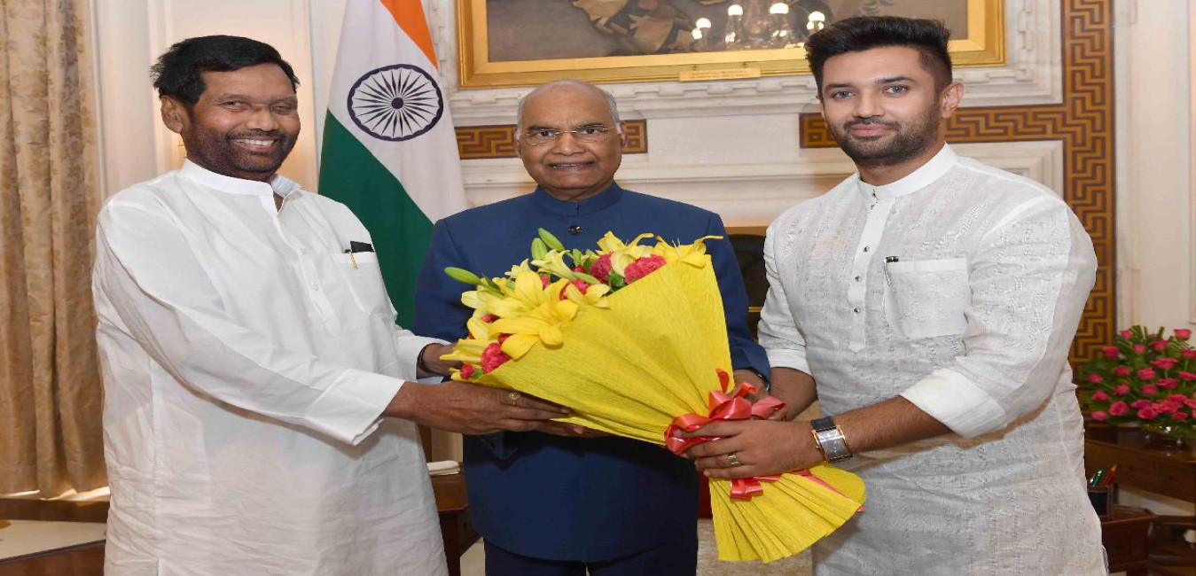 The Minister of Consumer Affairs, Food and Public Distribution, Shri Ramvilas Paswan along with his son Shri Chirag Paswan, MP (LS) meeting with the President of India, Shri Ram Nath Kovind, at Rashtrapati Bhavan on June 10, 2019.