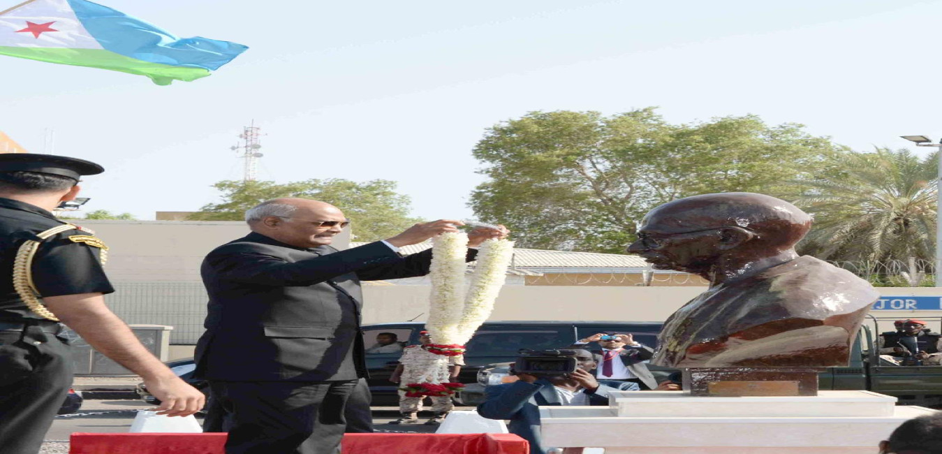 The President of India, Shri Ram Nath Kovind garlanding at the bust of Mahatma Gandhi, at Nelson Mandela Avenue, in Djibouti on October 03, 2017.