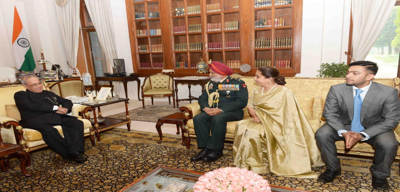 The President of India, Shri Pranab Mukherjee meeting with Lt. Gen. NS Ghei, Commandant, National Defence College and Hony ADC to the President alongwith Smt. Manpreet Ghei, at Rashtrapati Bhavan on December 02, 2016.