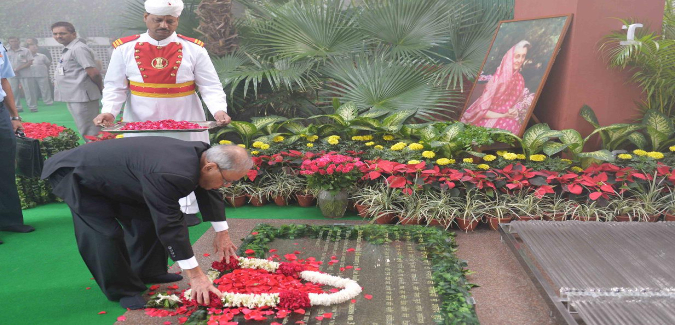 The President of India, Shri Pranab Mukherjee paying floral tributes to the former Prime Minister of India, Late Smt. Indira Gandhi, on her death anniversary, at 1, Akbar Road, in New Delhi on October 31, 2016.