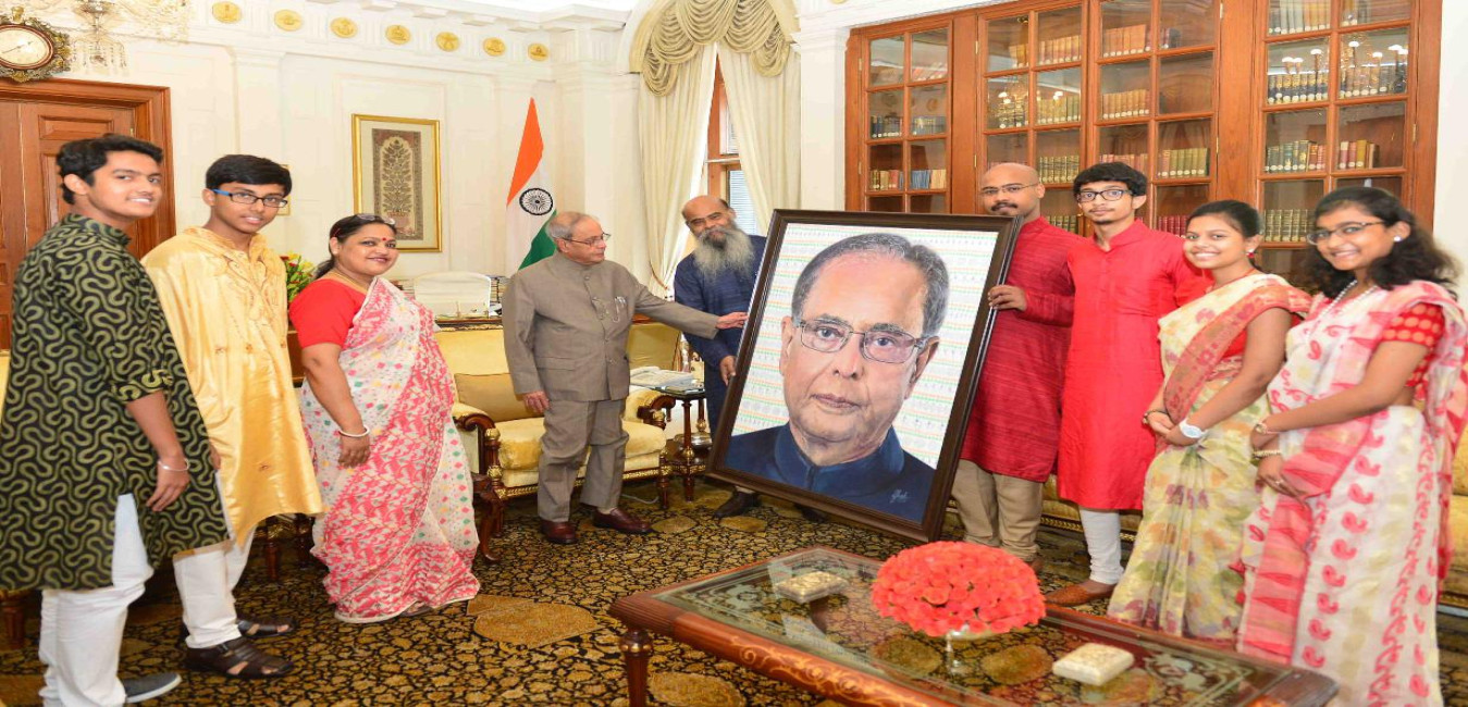 The President of India, Shri Pranab Mukherjee meeting with Shri Dipak Kumar Ghosh with others, at Rashtrapati Bhavan on June 21, 2016.
