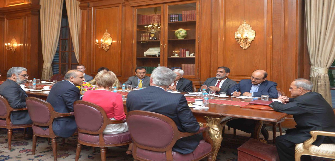 The President of India, Shri Pranab Mukherjee meeting with Mr. William J. Burns, President, Mr. Ashley J. Tellis, Senior Associates with others from Carnegie Endowment for International Peace, Washington DC, USA, at Rashtrapati Bhavan on April 06, 2016.