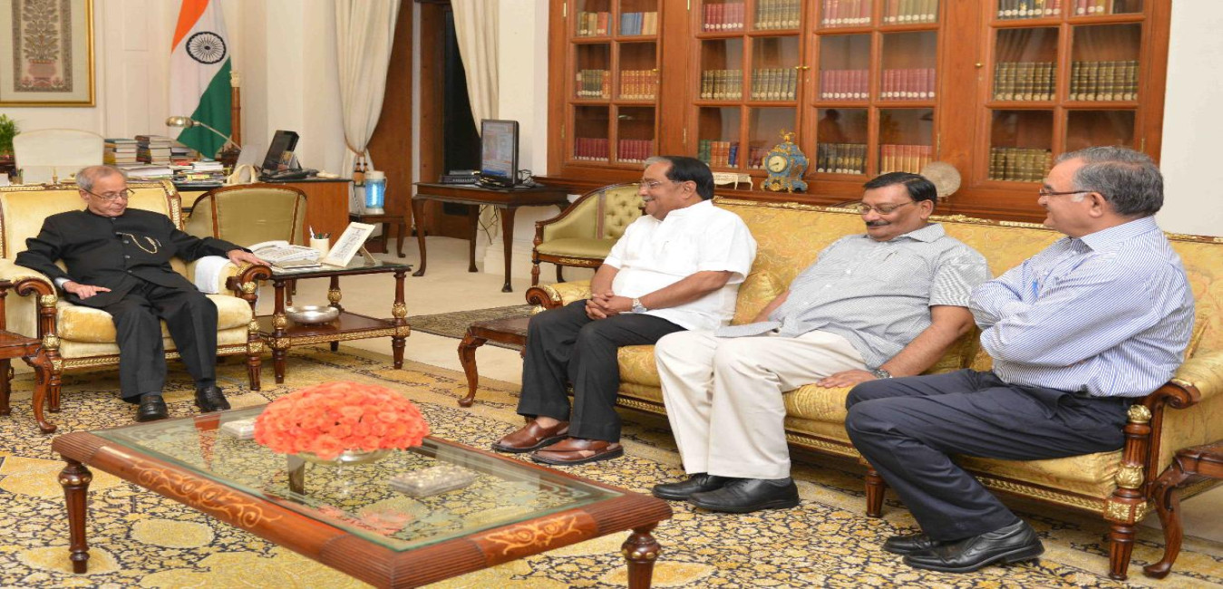 The President of India, Shri Pranab Mukherjee meeting with Prof. Alok Chakrvarty & Prof. Subrata Sar, Associate Professors, Vidyanagar College, South 24 Parganas, at Rashtrapati Bhavan on April 05, 2016.