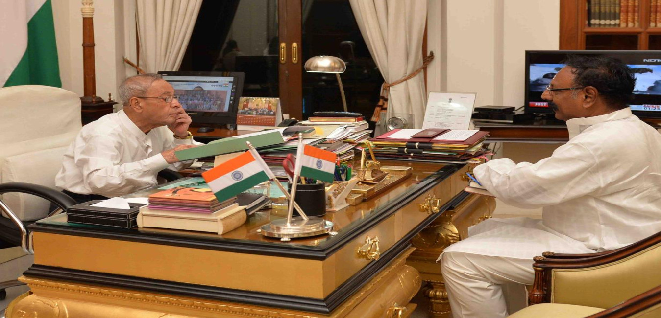 The President of India, Shri Pranab Mukherjee meeting with Shri C.K. Jaffer Shrief, former Union Minister of Railways, at Rashtrapati Bhavan on April 06, 2016.