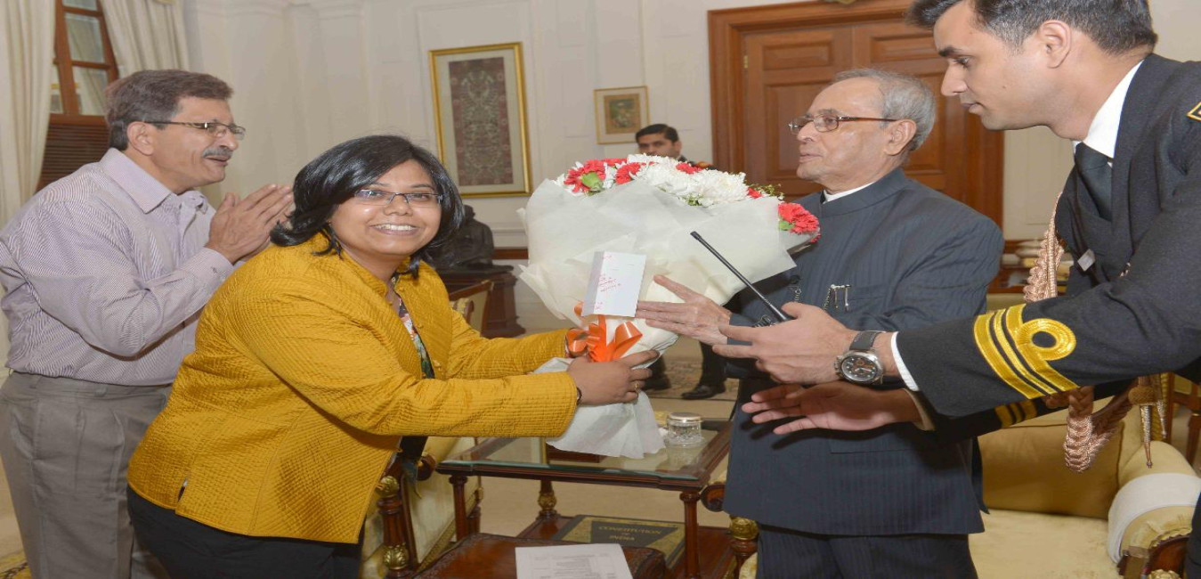 The President of India, Shri Pranab Mukherjee being greeted by Smt. & Shri K.R. Ravindran, World President, Rotary International, on the occasion of his 80th birthday, at Rashtrapati Bhavan on December 11, 2015 .