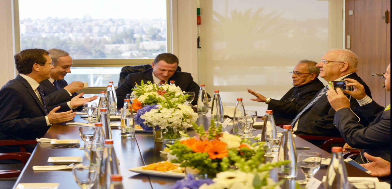 The President of India, Shri Pranab Mukherjee with the President of Israel, Mr. Reuven Rivlin, the Prime Minister of Israel, Mr. Benjamin Netanyahu, the Speaker of Knesset, Mr. Yuli-Yoel Edelstein and the Leader of Opposition, Mr. Issac Herzog, during a meeting, at Knesset, Jerusalem, in Israel on October 14, 2015.