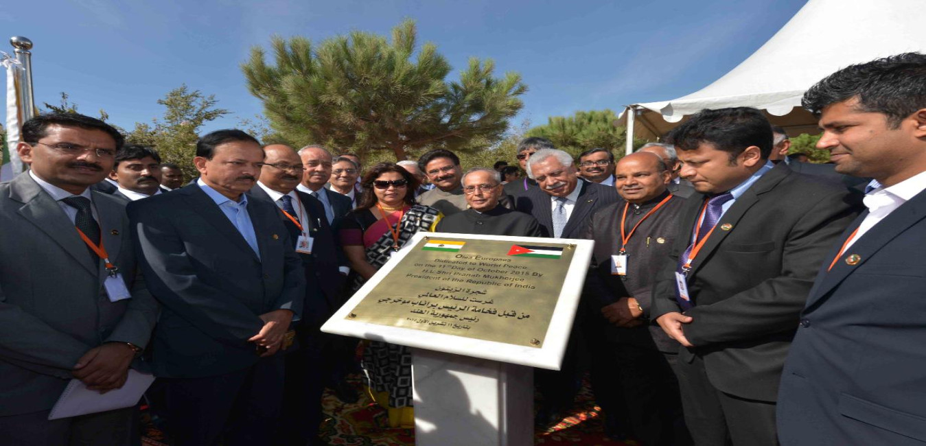 The President of India, Shri Pranab Mukherjee planting an Olive Tree at the Al Hussein Peace Park, at Amman in Jordan on October 11, 2015.
