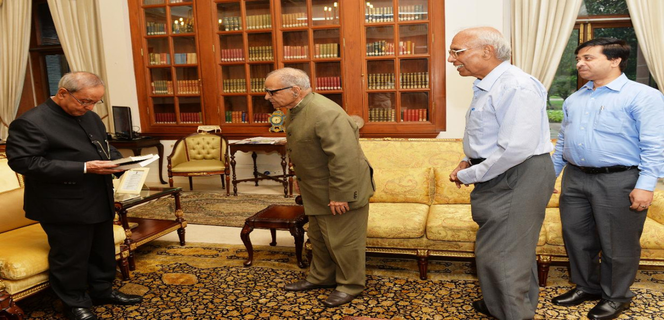 The President of India, Shri Pranab Mukherjee meeting with the Director, Indian Statistical Institute, Kolkata, Prof. Bimal K. Roy, at Rashtrapati Bhavan, in New Delhi on July 23, 2015.