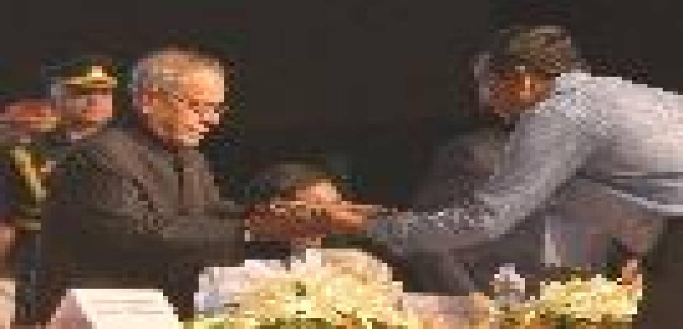 The President of India, Shri Pranab Mukherjee receiving the first copy of the book Uniki from the Chief Minister of Telangana, Shri K Chandrashekar Rao, at a function, in Hyderabad on July 03, 2015. The Governor of Maharashtra, Shri Chennamaneni Vidyasagar Rao and the Governor of Andhra Pradesh and Telangana, Shri ESL Narasimhan are also seen.