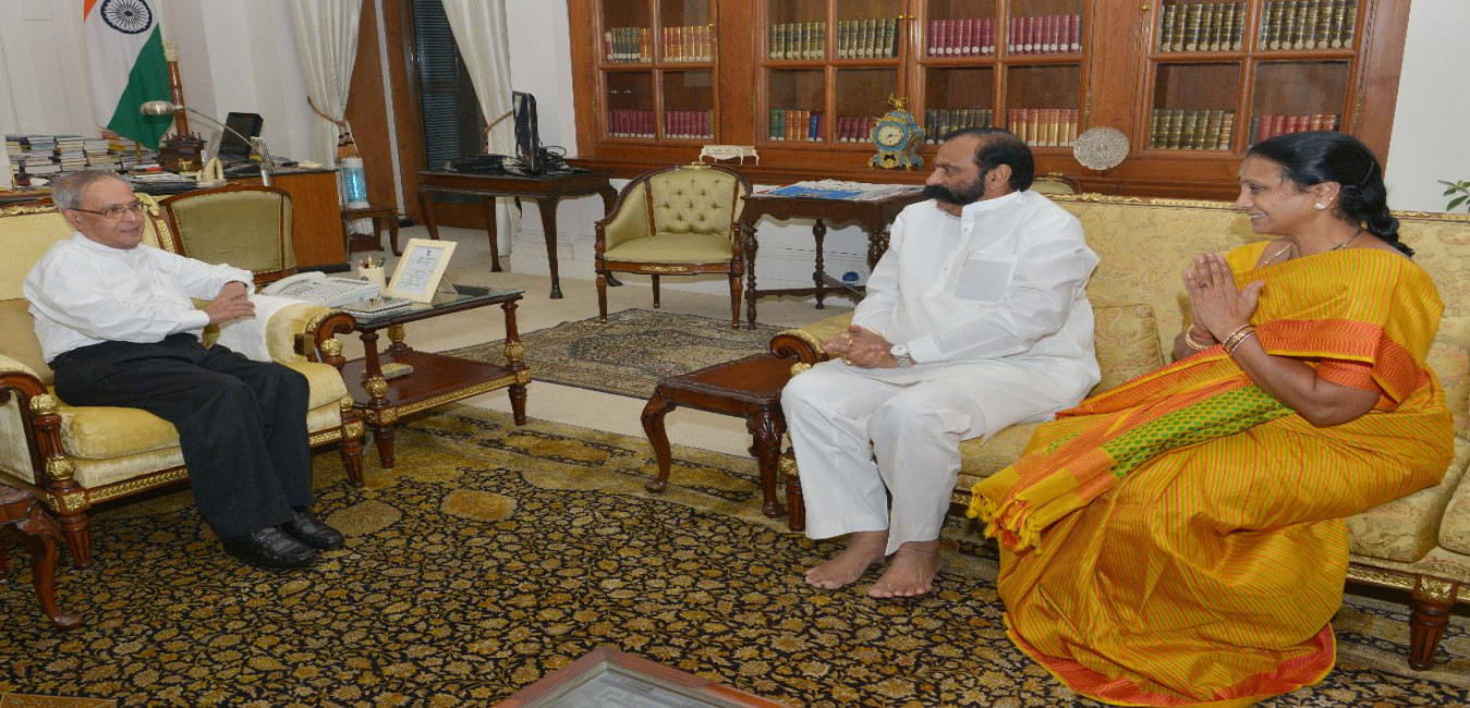 The President of India, Shri Pranab Mukherjee meeting with Smt. & Shri K. Bapi Raju, Ex-MP (LS), at Rashtrapati Bhavan, in New Delhi on June 22, 2015.
