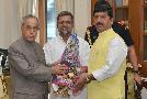 The President of India, Shri Pranab Mukherjee meeting with Dr. Anupam Hazra, MP (LS) alongwith his father Shri Debnath Hazra, at Rashtrapati Bhavan, in New Delhi on June 18, 2015.