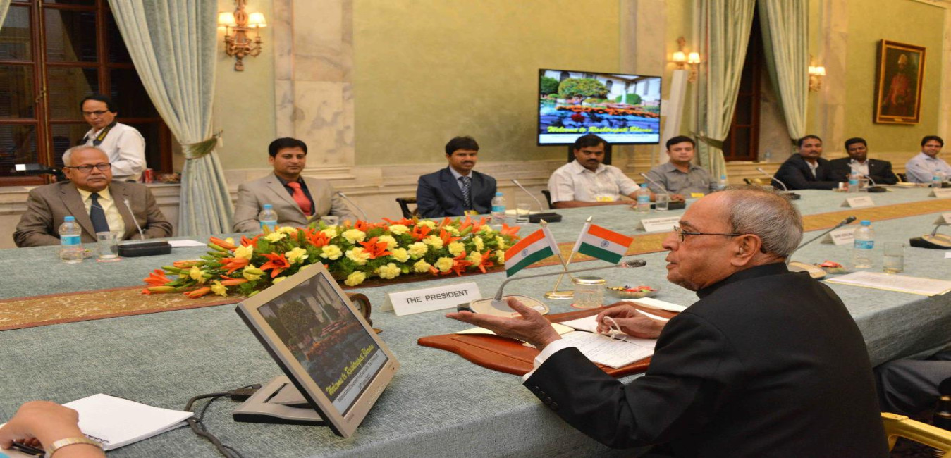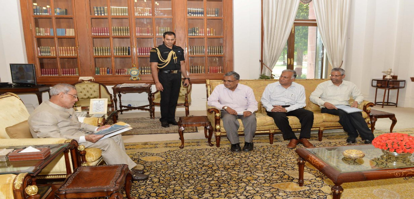 The President of India, Shri Pranab Mukherjee meeting with Dr. Kota Harinarayana, the Chairman, Board of Governor alongwith Shri D.M. Gupta, Member and Prof. S.G. Deshmukh, Director, Indian Institute of Information Technology, Design and Manufacturing, Jabalpur, at Rashtrapati Bhavan, in New Delhi on June 17, 2015.
