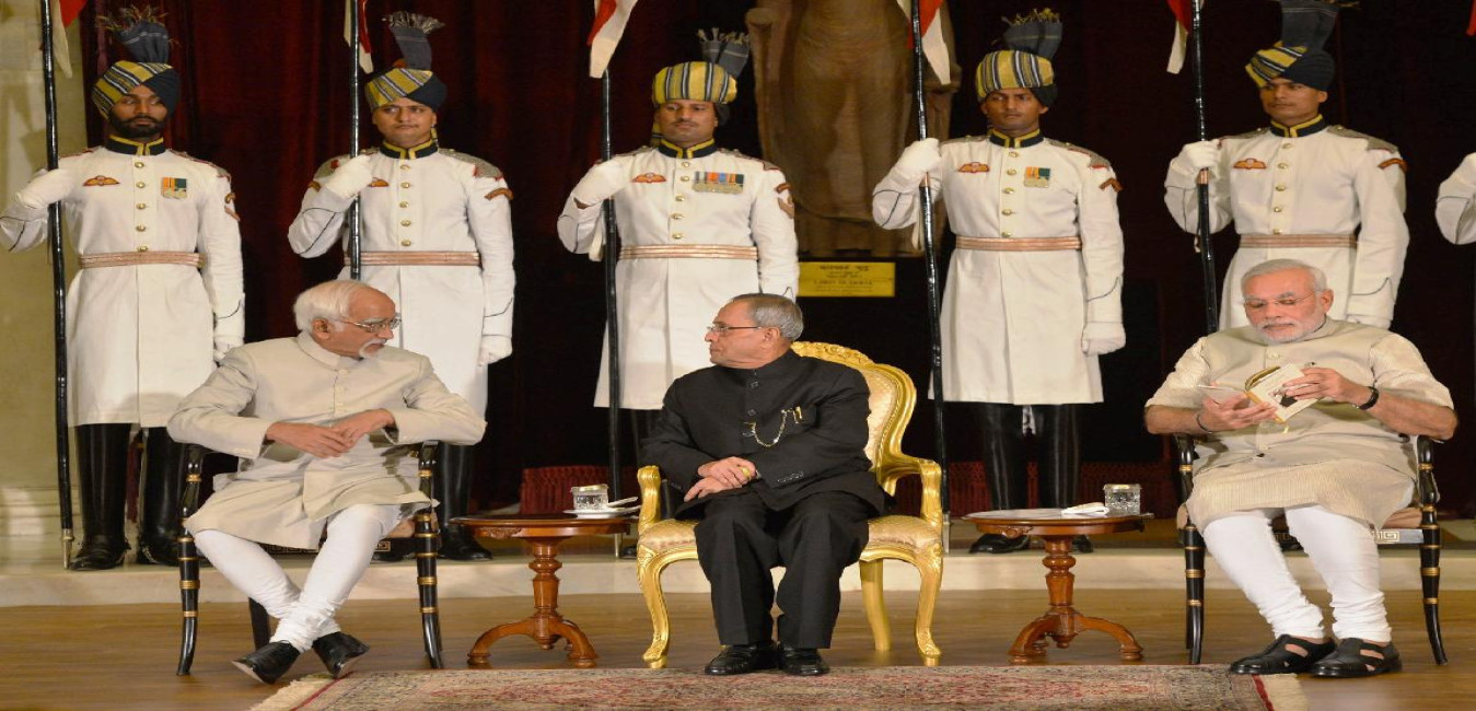 The President of India, Shri Pranab Mukherjee receiving the First Copy of the Indradhanush from the Prime Minister of India, Shri Narendra Modi at Rashtrapati Bhavan in New Delhi on July 25, 2014
