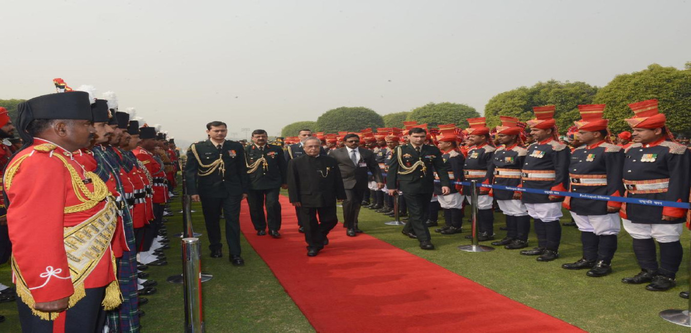 The President of India, Shri Pranab Mukherjee at the Ceremonial Reception of the President of the Federal Republic of Germany, HE Mr Joachim Gauck at Forecourt of Rashtrapati Bhavan in New Delhi on Feb 05, 2014