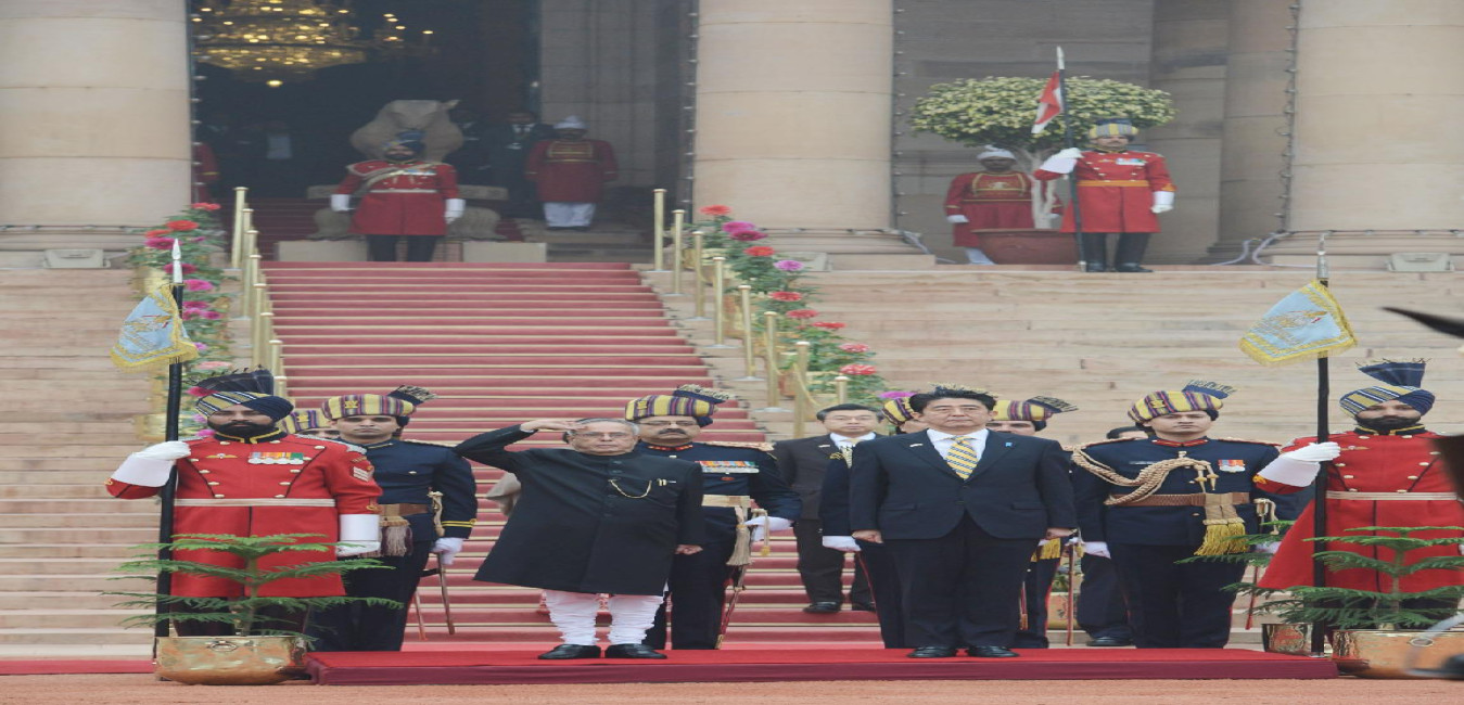 The President of India, Shri Pranab Mukherjee along with Distinguished Guest, the Prime Minister of Japan, HE Mr Shinzo Abe during departure from Rashtrapati Bhavan for attending the 65th Republic Day Parade at Rajpath in New Delhi on Jan 26, 2014