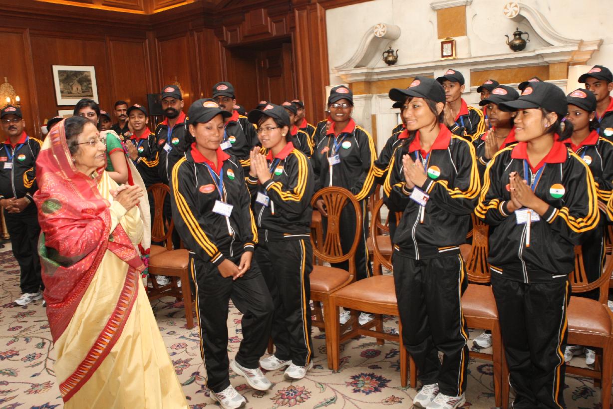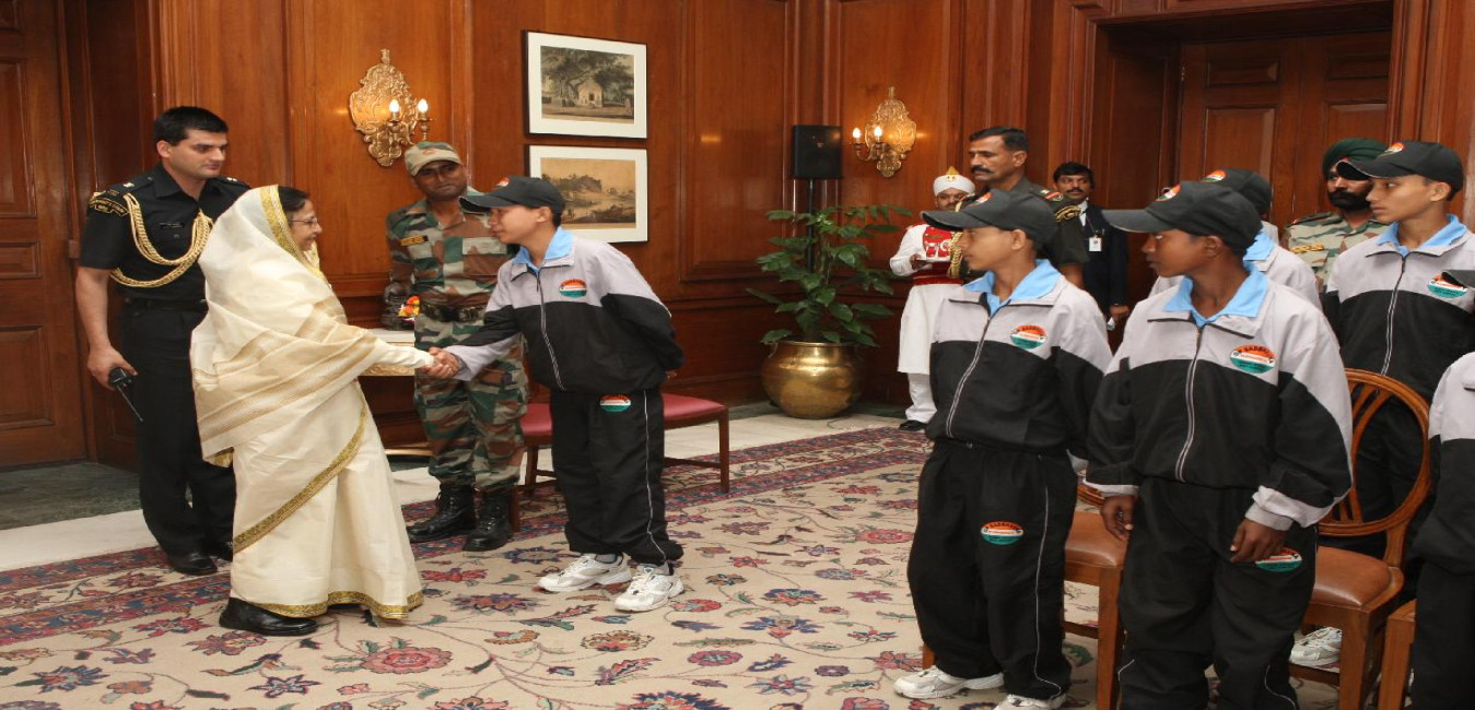 The President of India, Smt Pratibha Patil interacting with the Students from Sonitpur District of Assam when they are on a Tour organized under Operation Sadbhavana by the 71 Infantry Division Ordnance Unit at Rashtrapati Bhavan in New Delhi on Nov 11, 2011