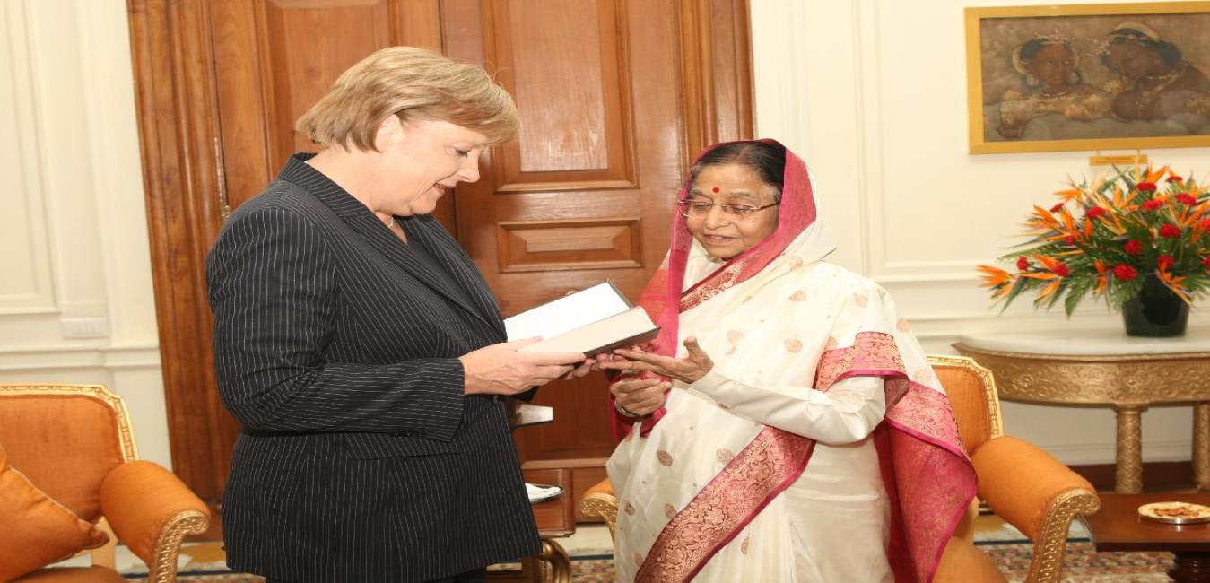 The Chancellor of the Federal Republic of Germany, HE Mrs Angela Dorothea Merkel calling on the President of India, Smt Pratibha Devisingh Patil at Rashtrapati Bhavan in New Delhi on May 31, 2011