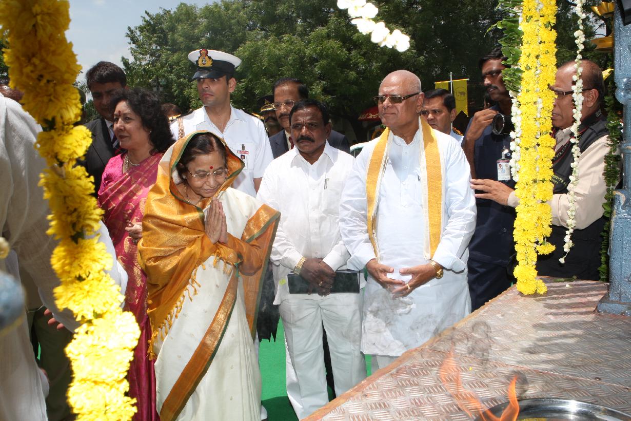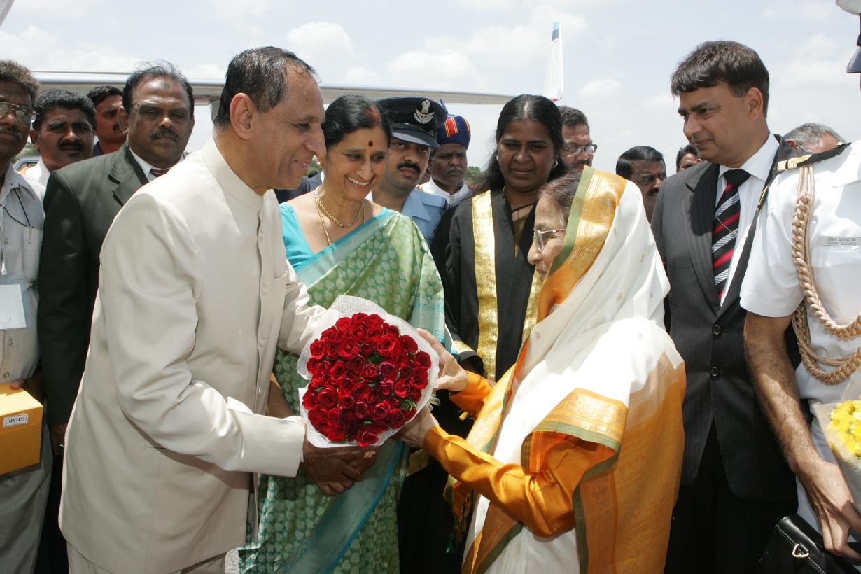 The President of India, Smt Pratibha Devisingh Patil being welcomed by Governor of Hyderabad, Shri E S L Narasimhan and Chief Minister, Shri Konijeti Rosaiah at Hyderabad Airport in Andhra Pradesh on July 04, 2010