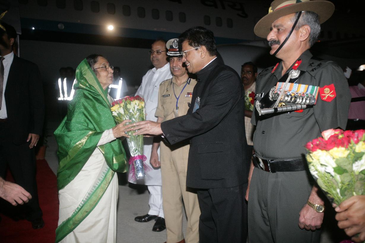 The President of India, Smt Pratibha Devisingh Patil being welcomed by the Governor of Assam, Shri Janaki Ballabh Patnaik at Guwahati in Assam on April 16, 2010