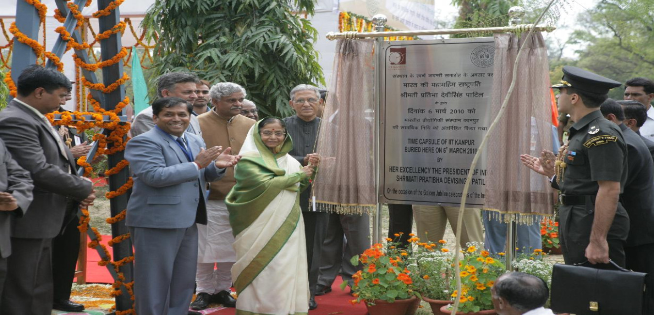 The President of India, Smt Pratibha Devisingh Patil during the Golden Jubilee of IIT Kanpur and lowering down the Time Capsule at the Indian Institute of Technology on the occasion of its Golden Jubilee at Kanpur in Uttar Pradesh on March 06, 2010