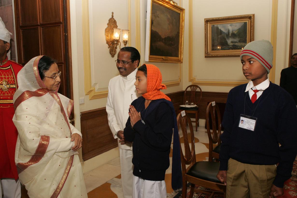The President of India, Smt Pratibha Devisingh Patil interacting with the Students from Vidya Bharati Mahavidyalaya, Amravati at Rashtrapati Bhavan in New Delhi on Jan 20, 2010