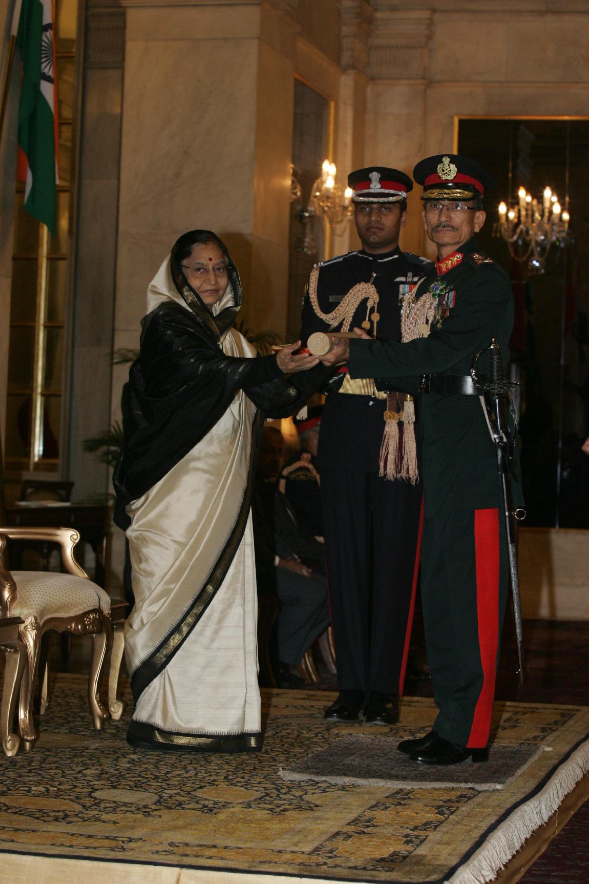 The President of India, Smt Pratibha Devisingh Patil conferring the Honorary Rank of General of the Indian Army the Chief of Staff of the Nepalese Army, General Chhatra Man Singh Gurung at Rashtrapati Bhavan in New Delhi on Dec 14, 2009