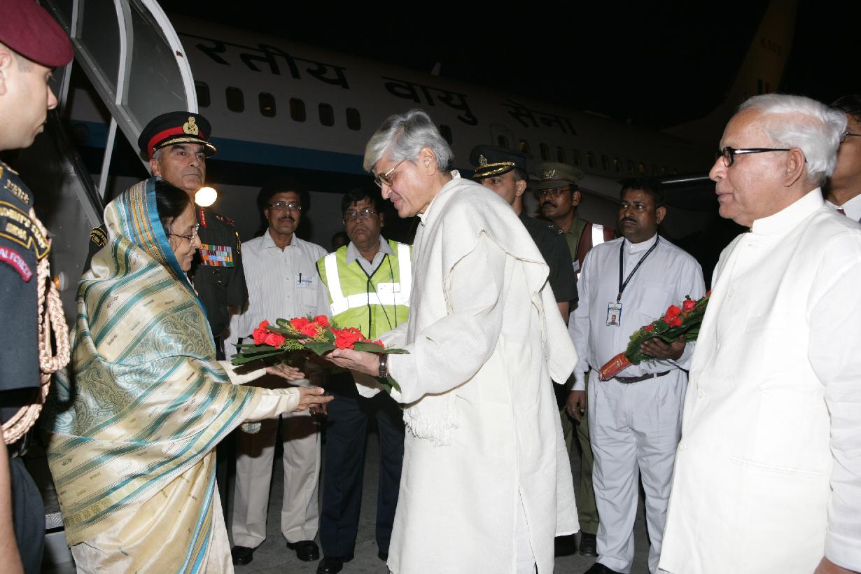 The President of India, Smt Pratibha Devisingh Patil being welcomed by the Governor of Kolkata, Shri Gopalkrishan Ghandi at Kolkata Airport in West Bengal on Dec 06, 2009
