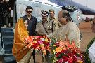 The President of India, Smt Pratibha Devisingh Patil being welcomed by the Governor of Odisha, Shri Murlidhar Chandrakant Bhandare and the Chief Minister of Odisha, Shri Naveen Patnaik at Bhubaneswar Airport in Odisha on Dec 08, 2009