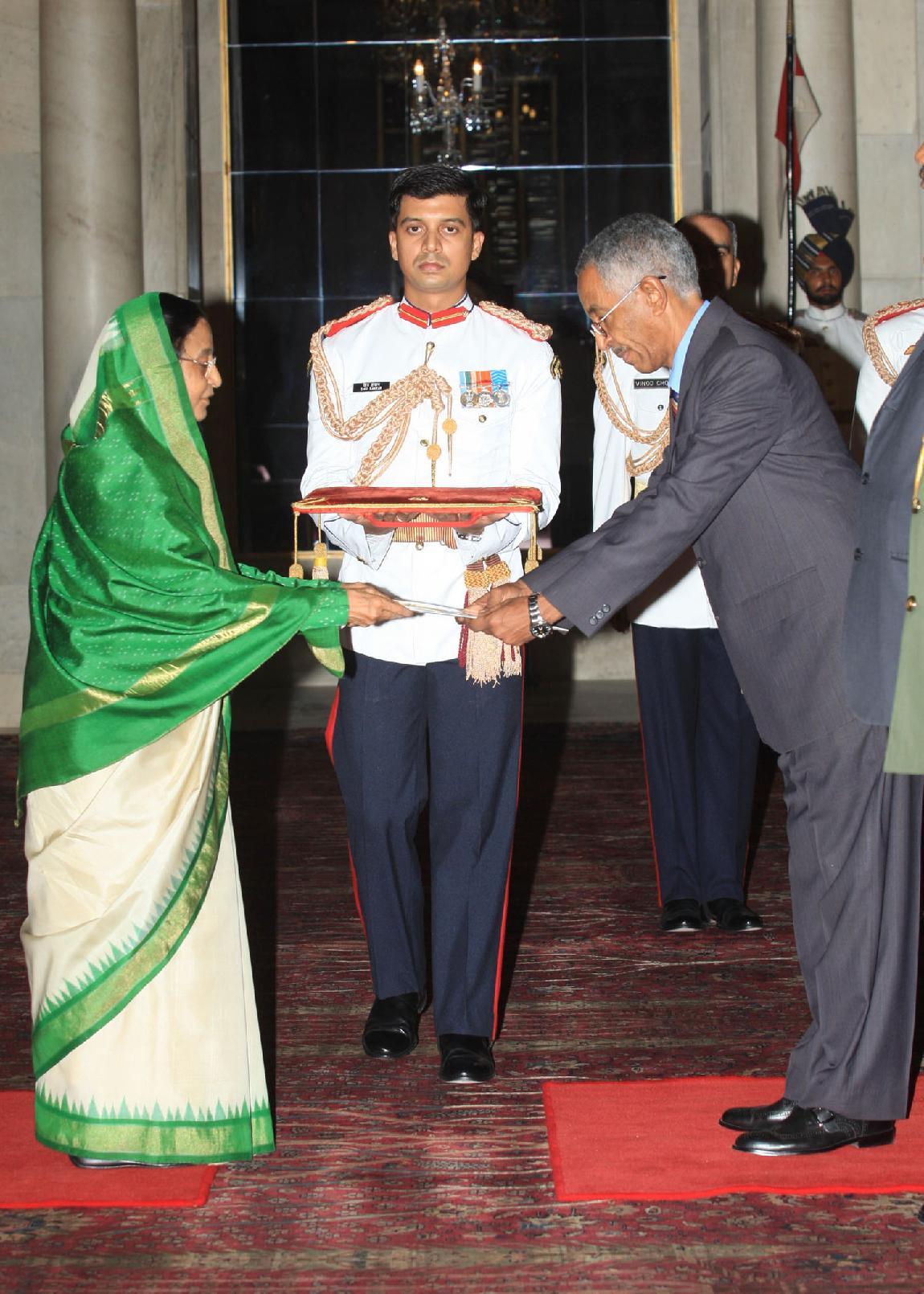The High Commissioner of Gambia, HE Mr Felix Badji presenting his credentials to the President of India, Smt Pratibha Devisingh Patil at Rashtrapati Bhavan in New Delhi on June 12, 2009