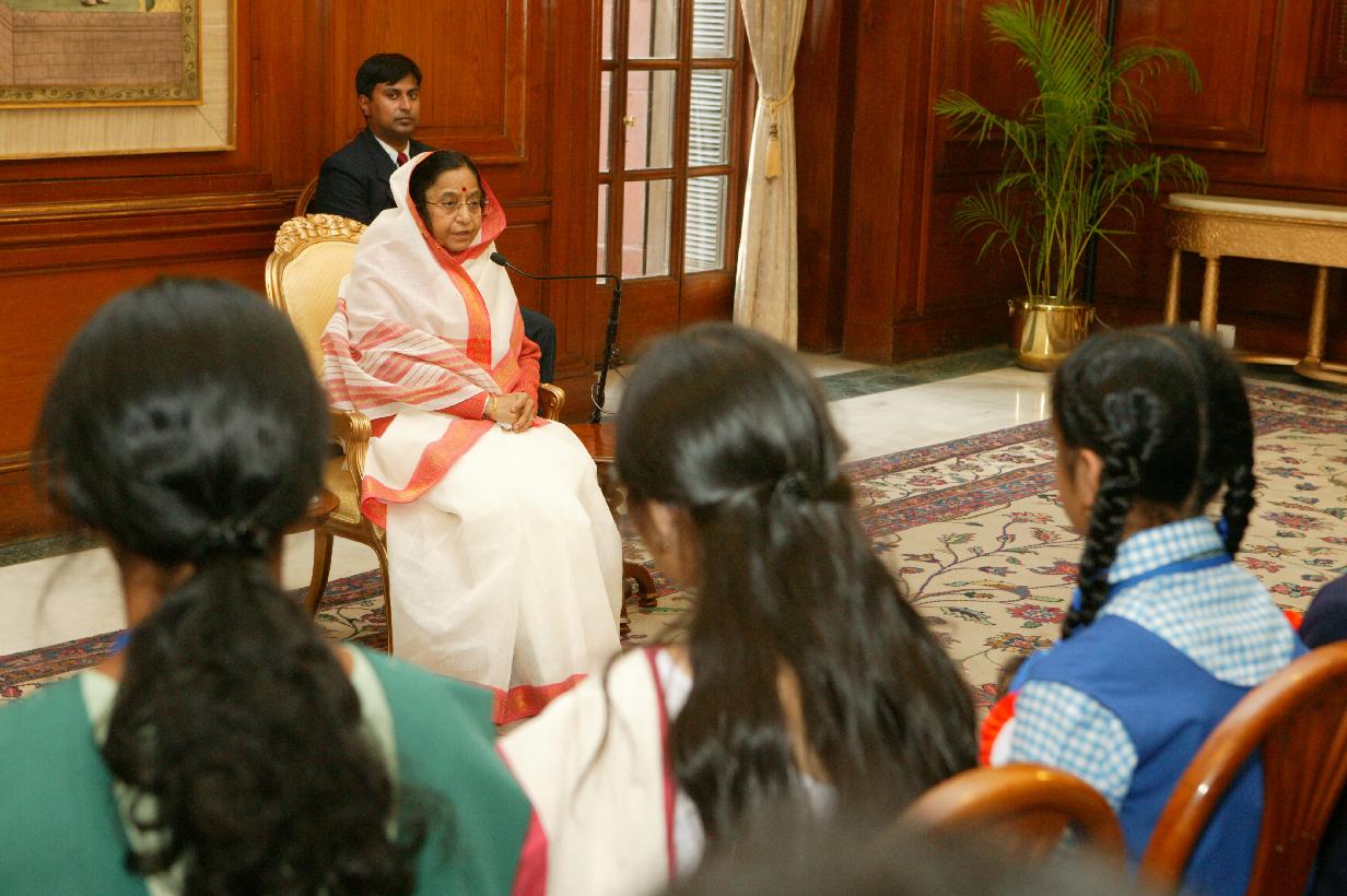The President of India, Smt Pratibha Devisingh Patil interacting with the School Children, the National Winners of the Tata Building Indian Essay Competition at Rashtrapati Bhavan in New Delhi on March 12, 2009