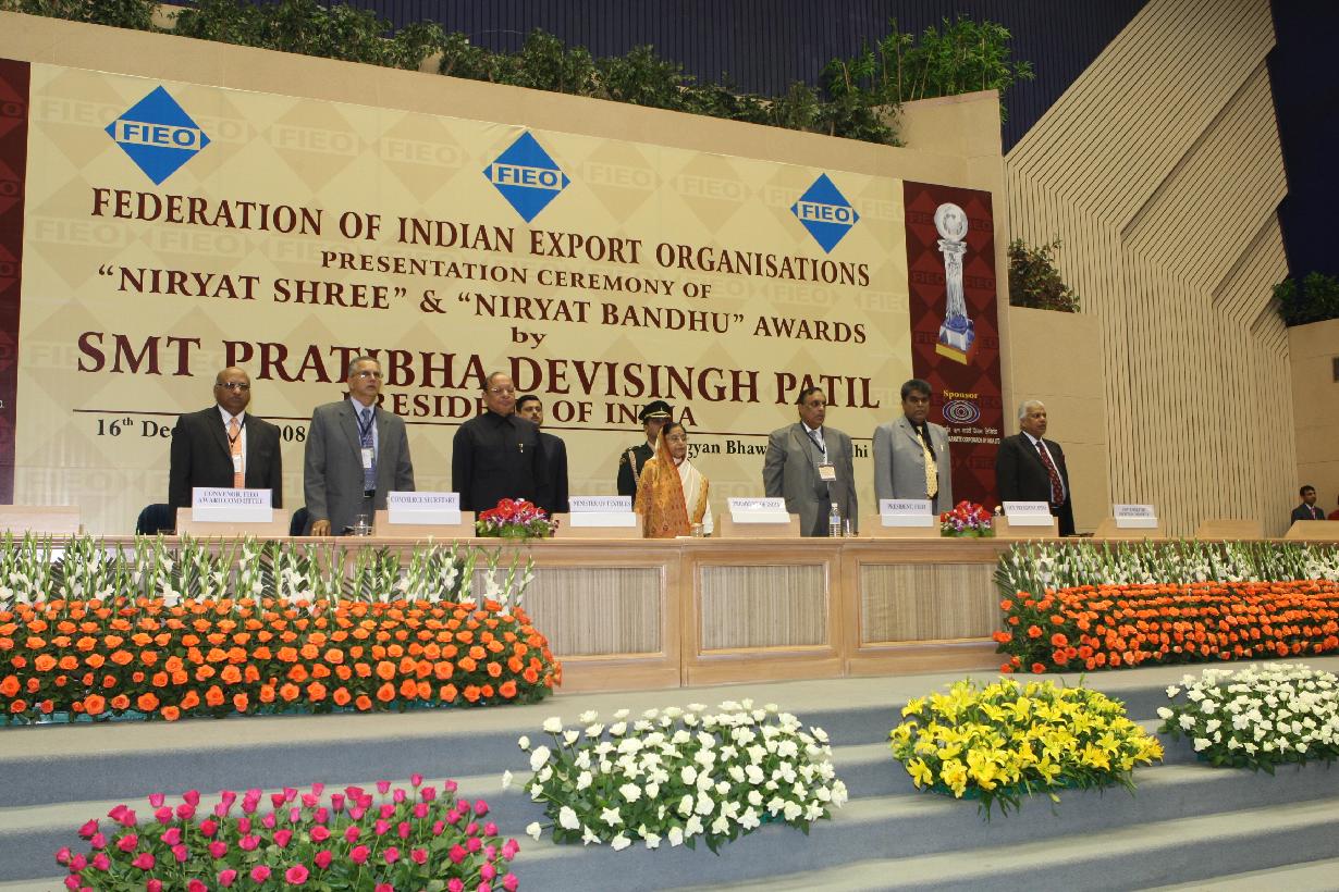 The President of India, Smt Pratibha Devisingh Patil presenting the Niryat Shree and Niryat Bandhu Awards instituted by the Federation of Indian Export Organisations for Outstanding Performance in exports at Vigyan Bhavan in New Delhi on Dec 16, 2008