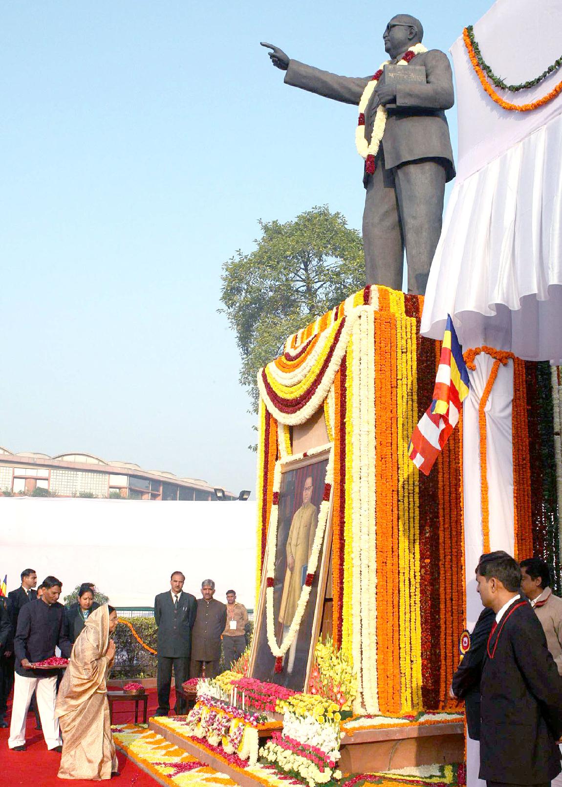 The President of India, Smt Pratibha Devisingh Patil offering floral tributes at the Statue of Baba Saheb Dr B R Ambedkar on his 53rd Death Anniversary at Sansad Bhavan Lawns in the Parliament House complex on Dec 06, 2008