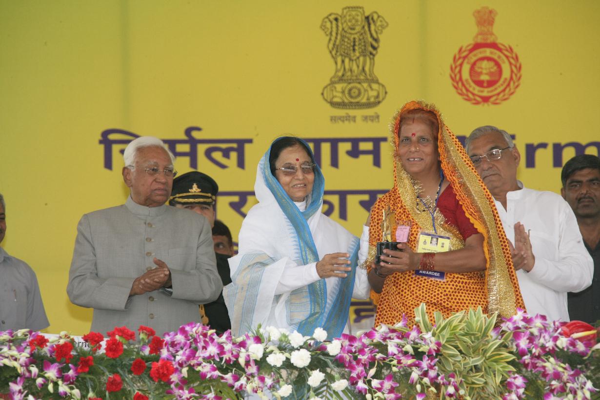 The President of India, Smt Pratibha Devisingh Patil presenting the Nirmal Gram Puraskar to one of the Award Winners at a Function at Hisar Airport in Haryana on Oct 17, 2008