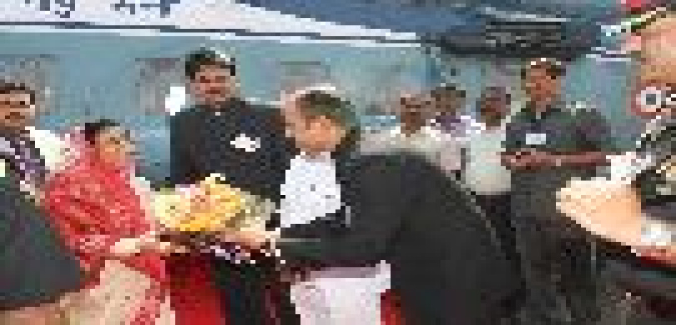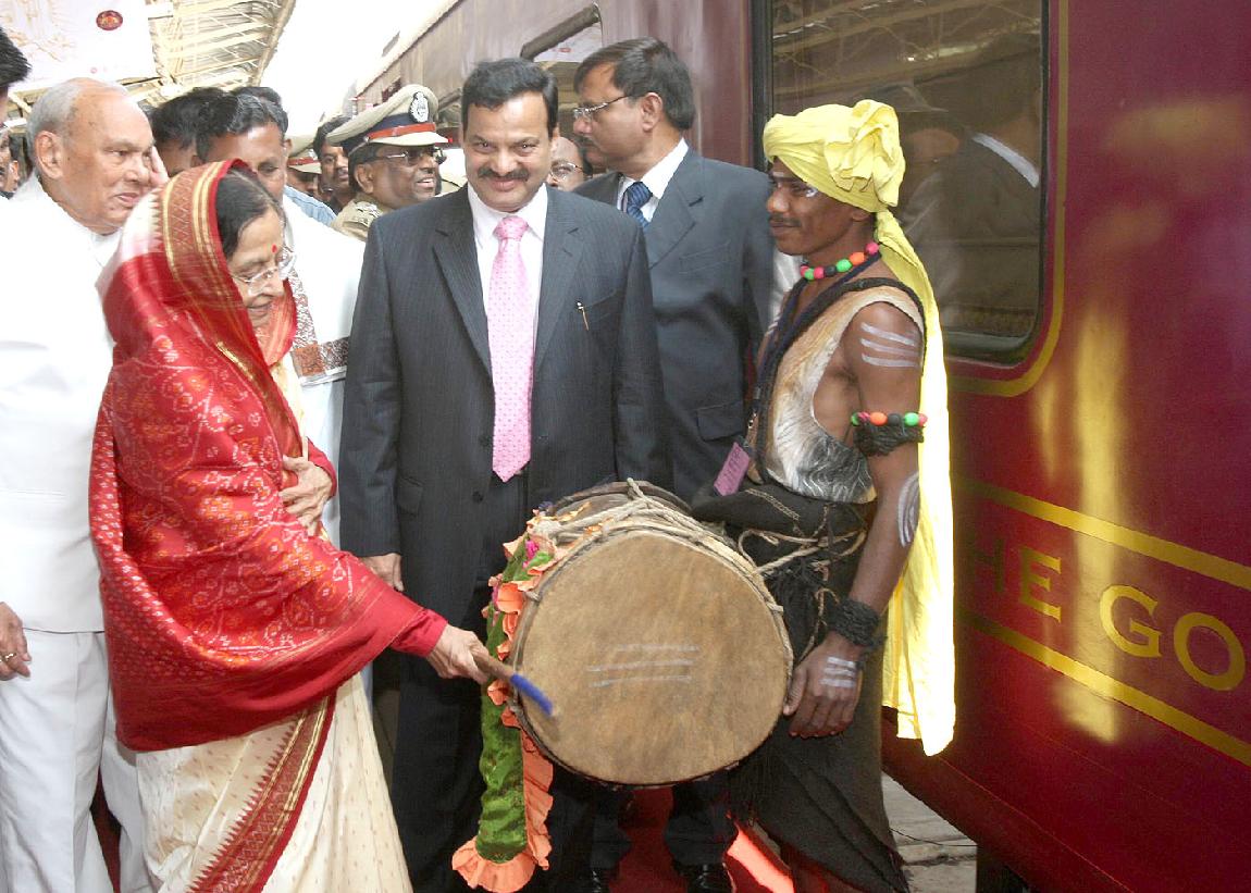 The President of India, Smt Pratibha Devisingh Patil waves from the 'Golden Chariot' train during its flag-off ceremony at Bangalore in Karnataka on Feb 02, 2008