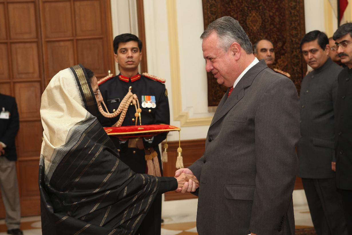 The Ambassador-Designate of Israel to India, HE Mr Mark Sofer presenting his credential to the President of India, Smt Pratibha Devisingh Patil at Rashtrapati Bhavan in New Delhi on Dec 12, 2007