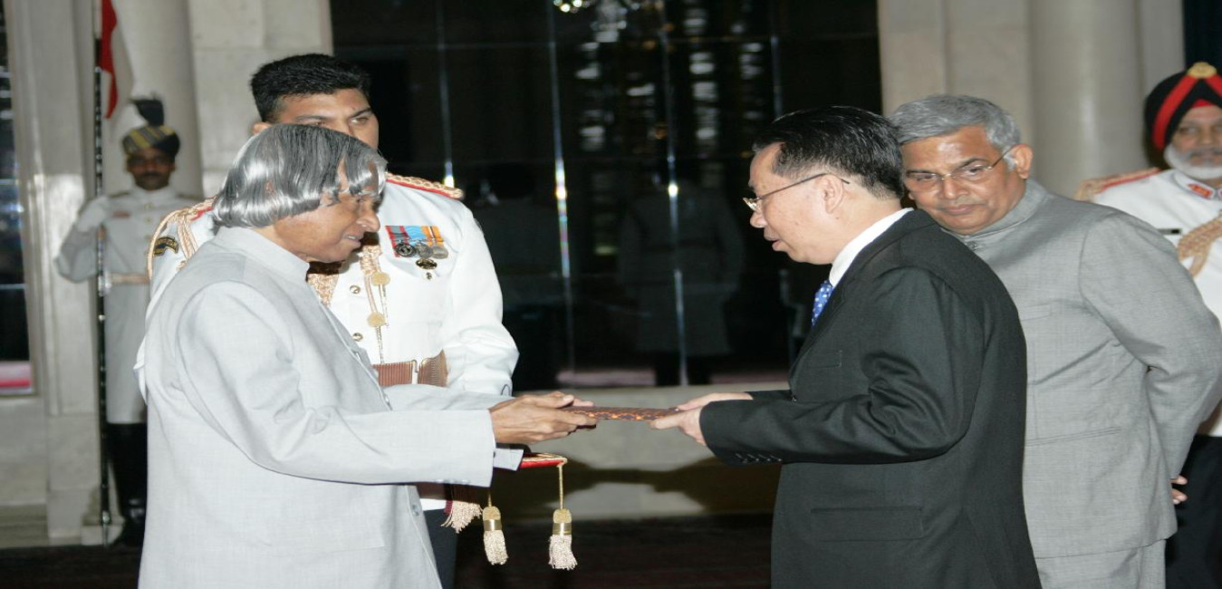 The Ambassador-Designate of the Kingdom of Combodia to India, HE Mr Choeung Buntheng presenting his credentials to the President of India, Dr A P J Abdul Kalam at the Ashok Hall of Rashtrapati Bhavan in New Delhi on Aug 08, 2005