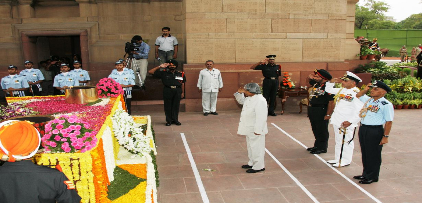 The President of India, Dr A P J Abdul Kalam paying tributes at Amar Jawan Jyoti at Indian Gate in New Delhi on Aug 15, 2005