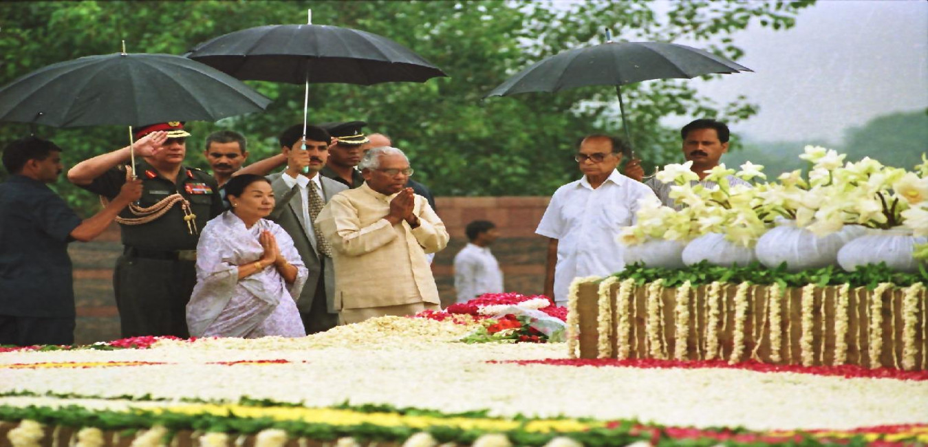 The President of India, Shri K R Narayanan paying homage to the Former Prime Minister of India, Late Shri Rajiv Gandhi on his Birth Anniversary at Vir Bhumi in New Delhi on Aug 20, 1999
