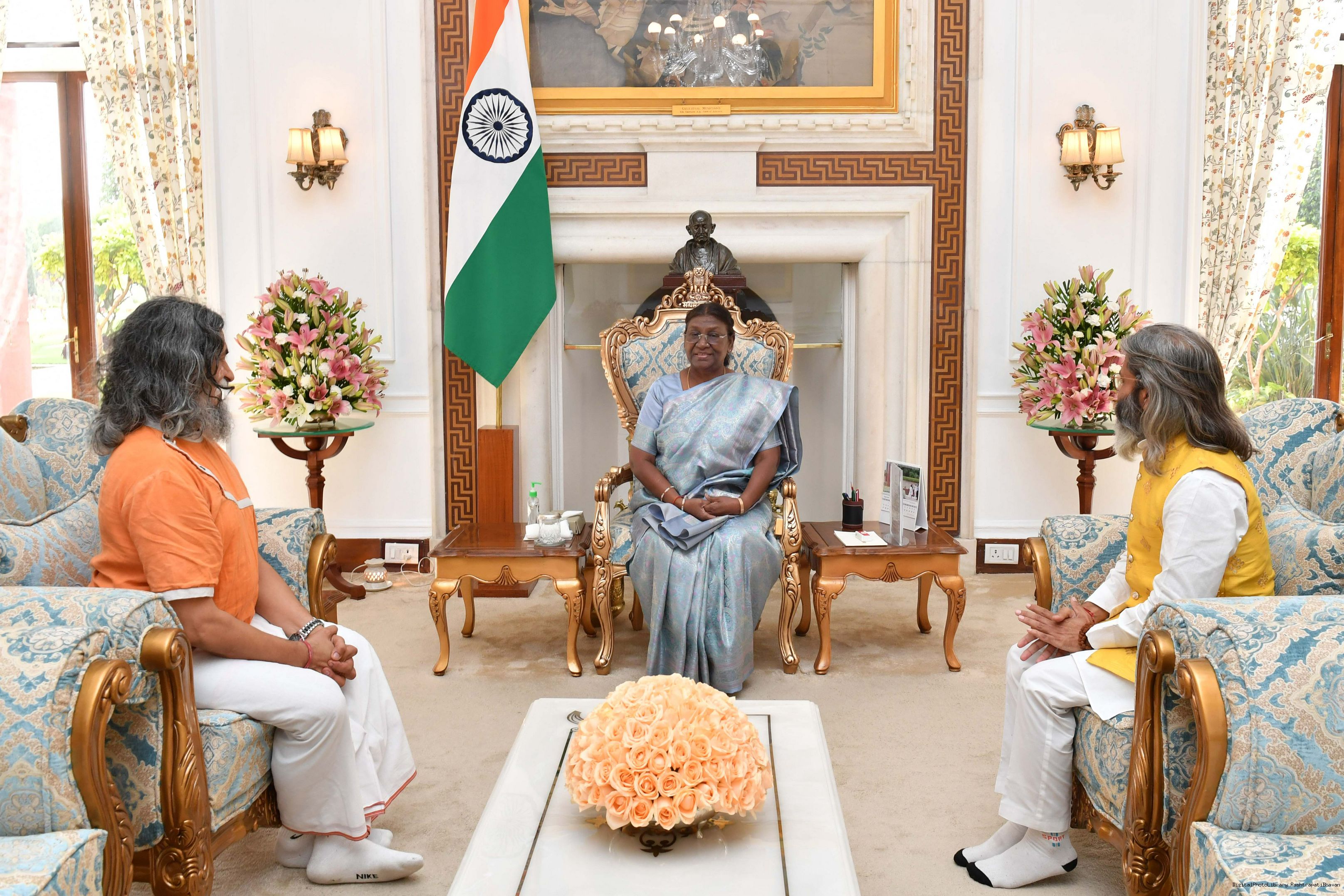Yogacharya Thakaram, Founder, Yogapeace Institute along with B.K. Yogi Manish Bhai meeting with the President of India, Smt. Droupadi Murmu at Rashtrapati Bhavan on August 28, 2023.